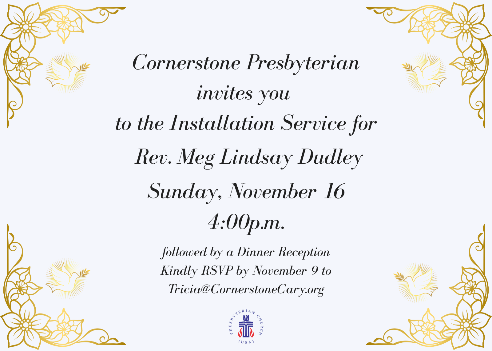 Join us for Rev. Meg’s Installation Service Posted October 17, 2025 by Tricia Cernoch Cornerstone Presbyterian invites you to the installation service for Rev. Meg Lindsay Dudley on Sunday, November 16 at 4:00p.m. followed by a dinner reception. Please RSVP by November 9 to Tricia@CornerstoneCary.org or via telephone 919-303-9200