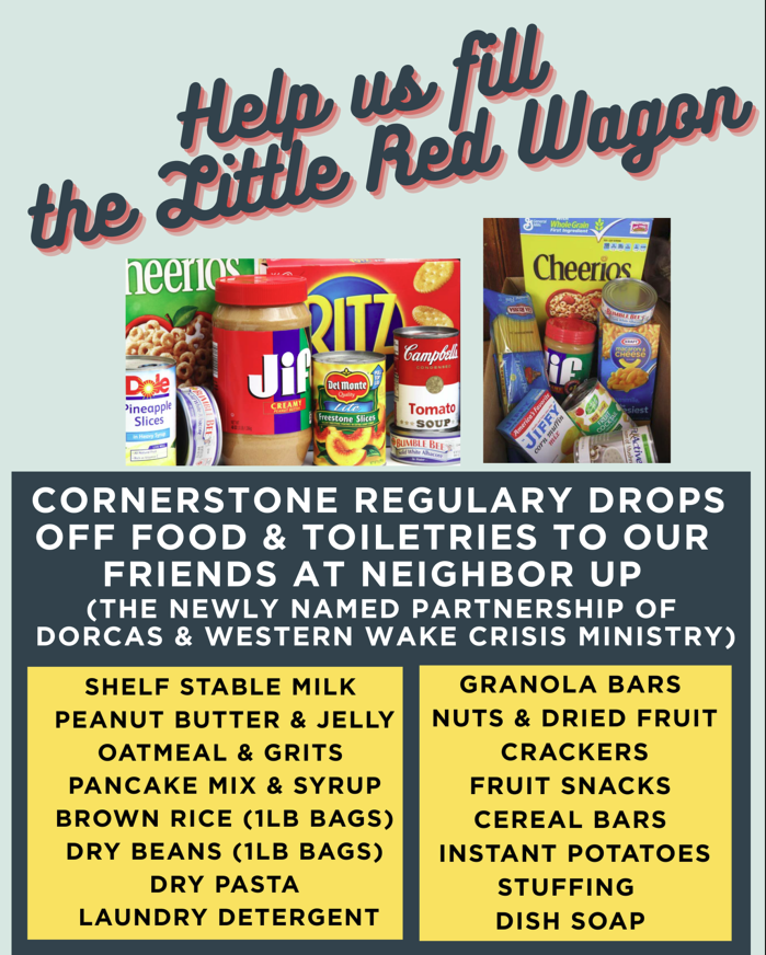 Now more than ever, our neighbors need food support. Please help us fill the little red wagon! Cornerstone regularly drops off food & toiletries at Neighbor Up, the new merger of Dorcas & Western Wake Crisis ministry. Please leave your donations in the red wagon near the narthex door. Items often requested include: boxed pasta, laundry detergent, 2lb. bag of flour, Syrup, condiments, shelf-stable milk (non-perishable), peanut butter and jelly, hot cereal (oatmeal, grits, etc.), pancake mix, cereal, brown rice (1lb bags), dry beans (1lb bags), canned pasta, crackers, snacks (granola bars, nuts, dried fruit, snack-size chips, cereal bars, lance crackers), Instant potatoes and stuffing, cooking oil, dish soap, baby wipes