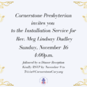 Cornerstone Presbyterian invites you to the installation service for Rev. Meg Lindsay Dudley on Sunday, November 16 at 4:00p.m. followed by a dinner reception. Please RSVP by November 9 to Tricia@CornerstoneCary.org or via telephone 919-303-9200