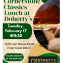Cornerstone Classics Lunch Outing: Join the group and Rev. Meg for lunch and fellowship! Meet at Doherty’s, 1979 High House Rd. in Cary, Tuesday, February 17 at 11:30. Cornerstone Classics welcomes those 55+ (or close to it). Please sign up in… Read more »