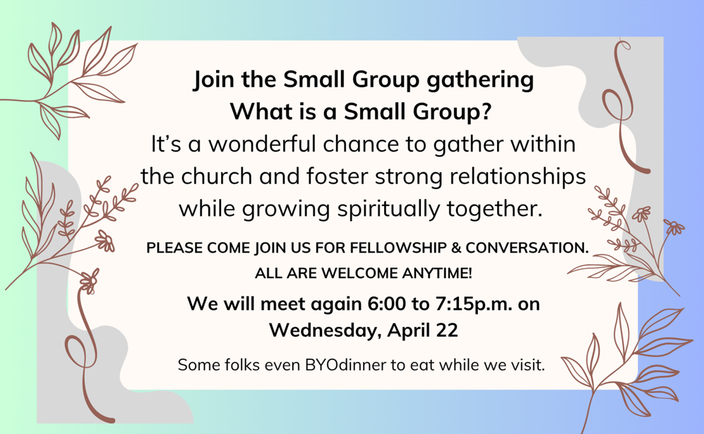 Please join us on April 22 from 6:00 to 7:15pm. What is a small group? It’s a relaxed, welcoming space within our church family where we build meaningful friendships and grow spiritually together. New faces are always welcome! Questions? Reach out to the office.