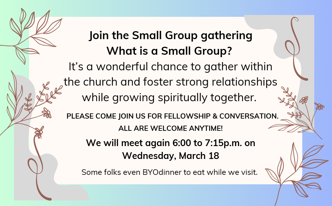 Please join us on March 18 from 6:00 to 7:15pm. What is a small group? It’s a relaxed, welcoming space within our church family where we build meaningful friendships and grow spiritually together. New faces are always welcome! Questions? Reach out to the office.